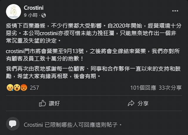 意大利式糕點店Crostini昨(13日)晚10時許,在facebook專頁上發帖指因疫情致經營環境惡劣,決定門市將會營業至9月13日,之後將會全線結束營業。消息一出,惹起不少網民及顧客留言批評,有人直言「點解可以個幾鐘前先黎講」,亦有人質疑「咁coupon 點呀?」並指近日在婚展購買大量餅卡仍未兌換,有人直指店舖想結業前「水人一筆」,並要求Crostini交代賠償安排。