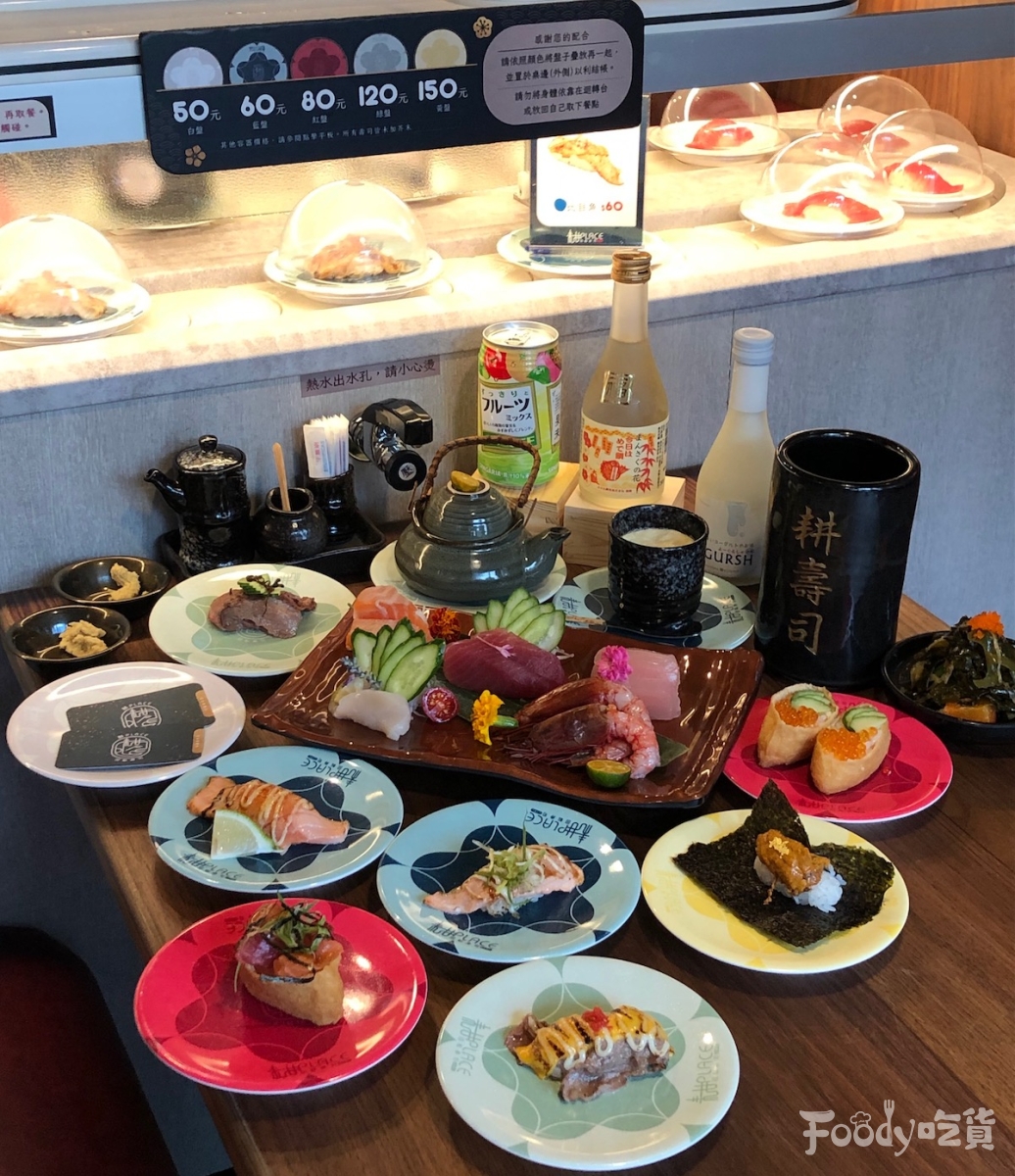 ▼點餐是以迴轉壽司搭配平板點選的模式,不同顏色的壽司盤價格不同,想吃什麼可以自己拿取。「耕place」充滿酒館微醺氛圍,櫃檯旁擺放著很多日本酒,服務人員會幫忙介紹風味,並推薦可以搭配的餐點~