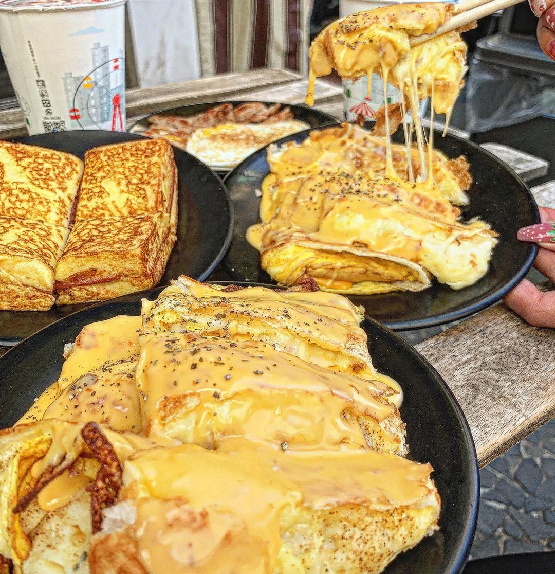▼「Bubuking鐵牛早餐車」室內和室外都有用餐區。這家主推酥皮蛋餅,蛋餅造型搶眼,每一口都會牽絲,入口滿滿的起司味,令人無法抗拒!而且份量非常足,吃完後很飽很滿足。
