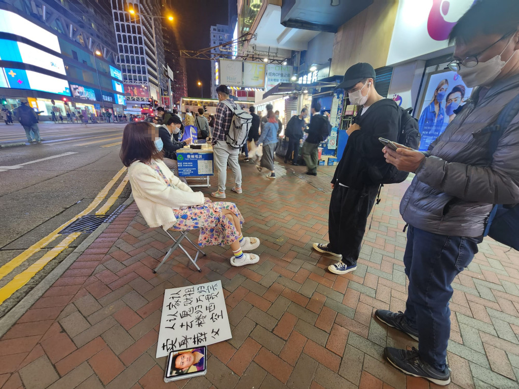 女子在旺角街頭聲稱要30萬元賣身葬父。(黃文威攝)
